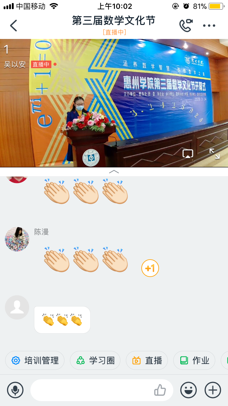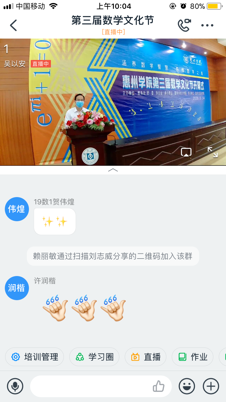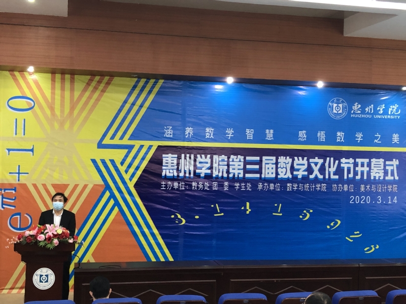 3月14日上午,惠州学院第三届数学文化节开幕式通过视频直播的方式隆重举行。我校副校长刘国栋、学生处处长胡萍、团委书记赖昭华、教务处副处长罗晓敏、美术与设计学院党总支书记游少华、数学与统计学院党政班子成员及教师代表在文城视频会议室参加了开幕式,而全校1000余名师生通过钉钉软件直播形式参加了线上活动。开幕式由数学与统计学院党总支书记许秋娟主持。