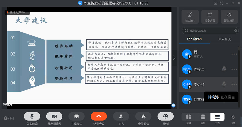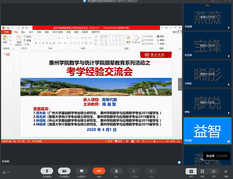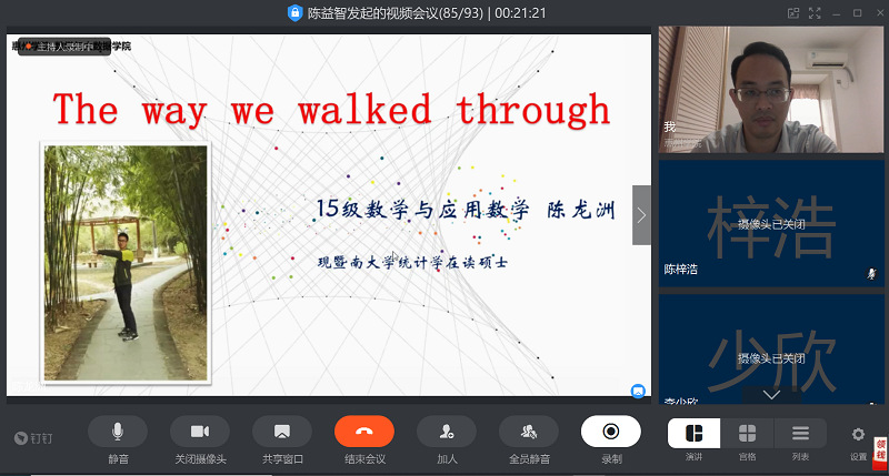为加强大一新生在疫情防控期间的思想政治教育,传播、树立榜样的力量,帮助大一新生更好地做好大学四年的学习规划以及提升数学学习热情与成效,4月1日上午,我院陈益智老师在专业课程《高等代数》中嵌入朋辈教育活动,为2019级数学与应用数学专业5、6班同学举行了一场线上朋辈考学经验交流会。活动邀请了我院2019届数学与应用数学专业的四名在读硕士生校友参加。