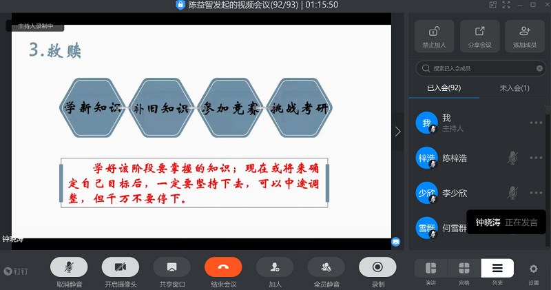现就读于湘潭大学计算数学专业硕士研究生的钟晓涛校友分享了他大学四年从迷失到醒悟,再到救赎的过程。让同学们了解到遇到类似问题时应当如何应对。在这个过程中,他也总结了一些经验,比如在校期间要敢于接受学习新知识的挑战,珍惜宝贵学习时间,努力学习,同时也要坚持锻炼身体,在遇到困难和挫折时要多反思等等。他还勉励学弟学妹要树立坚定的信心,做一个持之以恒的青年学子。