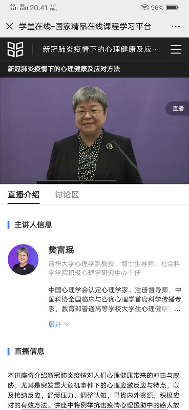 为缓解同学们面对当前疫情心理压力,近日,我院团总支组织开展本学期第一次集体团课学习,全体团员及辅导员老师通过线上直播方式观看了由清华大学樊富珉教授主讲的题为《新冠肺炎疫情下的心理健康及应对方法概要》的心理健康讲座。