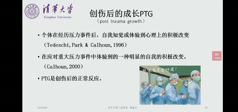 樊教授向同学们解读了在突发重大事件危机下的心理应激反应特点,系统阐述了人们在经历危机事件时可能出现的心理变化情况以及大众面对疫情的心理压力反应过程。樊教授指出,人们在新冠疫情下出现的一系列心理反应,将极大增加个人的心理负担,从而引发生理疾病,甚至蔓延成为社区问题,严重影响正常的生活秩序。他列举了若干错误的心理危机应对方法,同时就如何化解心理压力,如何进行正确的心理调适,进行一一讲解;他指出,正确的心理调适方法是五助法,即自助、受助、专助、助人、互助。