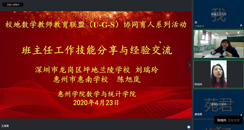 2020年4月23日下午,我院特邀深圳市龙岗区坪地兰陵学校的刘瑞玲老师、惠州市惠南学校的陈旭岚老师,为学院2017级数学与应用数学专业学生作了一场题为《班主任工作技能分享与经验交流》的专题讲座。本次活动由教务处主办、数学与统计学院承办。讲座由王海青老师主持。