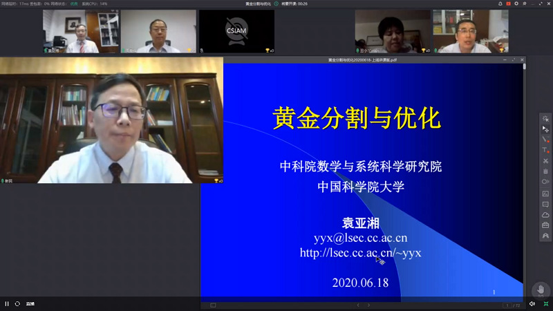 6月18日晚上,我院师生通过线上直播的形式共同观看数学文化大讲堂第八讲——《黄金分割与优化》。本次讲座是第三届数学文化节系列活动之一,由中国科学院院士袁亚湘主讲。