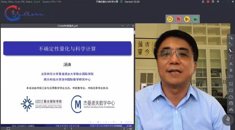 6月27日下午,我院组织师生通过线上直播的形式观看了由中国科学院院士汤涛主讲的题为《不确定量化与科学计算》的专题讲座。该系列讲座是CSIAM网络科普讲座之一。同时也是我校第三届数学文化节中文化讲堂活动的主要内容。