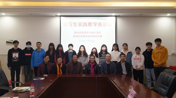 为扎实推进、有效落实2017级学生教育实习工作,并继续推进党建合作共建工作,2020年12月23日下午,数学与统计学院党总支许秋娟书记、赵显贵副院长、数学系刘玉彬主任、教工第一支部王海青书记和实习指导教师李鹏博士一行到我院挂钩联系的惠阳崇雅实验学校初中部进行教育实习中期检查和座谈交流。
