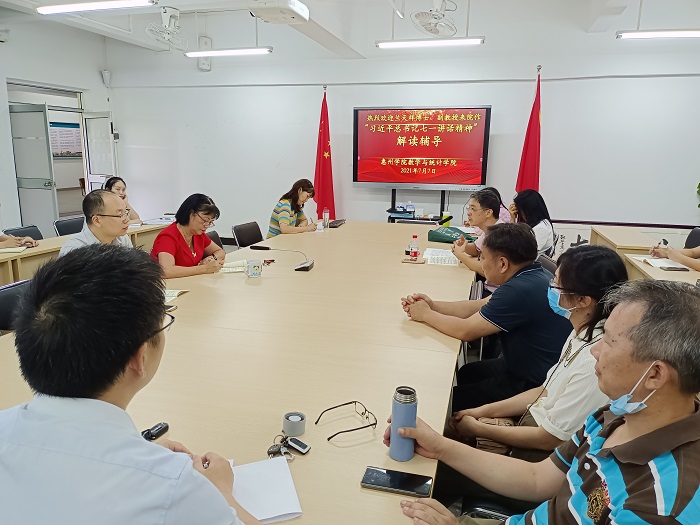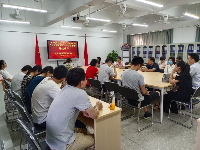 2021年7月7日下午,我院组织党史学习教育专题学习会,学习会邀请了马克思主义学院副教授兰天祥博士全程讲解和辅导学习,学习会由学院党总支书记许秋娟主持,全体无课的教职工参加了本次学习会。