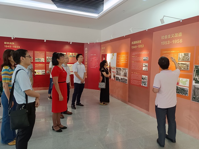 活动第一阶段是现场教学。在旭日科技大楼A座一楼“百年恰是风华正茂——中国共产党百年历史回顾展”展厅,兰天祥博士为全体观展老师作现场解说教学,对展览中的“新民主主义革命时期”“社会主义革命和建设时期”“改革开放和社会主义现代化建设新时期”“中国特色社会主义新时代”等版块内容进行了详细解读。