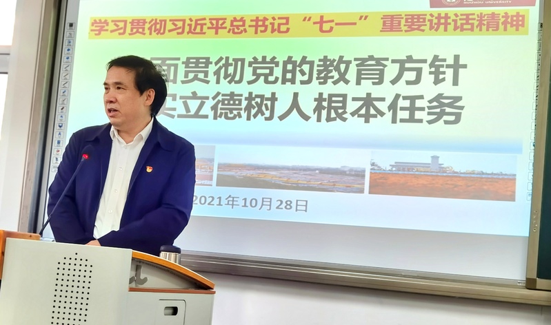 刘国栋副校长围绕深入学习贯彻习近平总书记“七一”重要讲话精神,从深刻领会党的百年辉煌历程和取得的伟大成就等方面进行了全面深入系统的解读和阐释。他要求大家要在深入学习、融会贯通、身体力行中不断提高政治判断力、政治领悟力、政治执行力,不断深化对习近平总书记“七一”重要讲话精神的认识理解和把握。刘副校长的讲座主题鲜明,内涵丰富,令人深受启发,既是一场精彩的专题辅导课,更是一堂别开生面的思想政治教育课。讲座中,刘副校长将党的教育方针的演变史贯穿于党的百年奋斗的光辉历程中,详细阐述中国共产党不断发展和完善党的教育方针,他要求全体师生要深入学习习近平总书记“七一”重要讲话精神和习近平总书记关于教育的重要论述,全面贯彻党的教育方针,落实立德树人根本任务。要在敏听力、下猛力、上真力、聚合力、出实力上下功夫,要在“两个大计”引领下、“九个坚持”指引下、“政社校家”联合下、“风清气正”环境下、“全民学习”背景下全面落实立德树人根本任务,牢牢掌握住人才培养工作的主动权。
