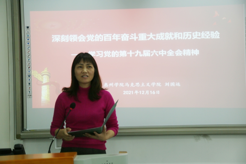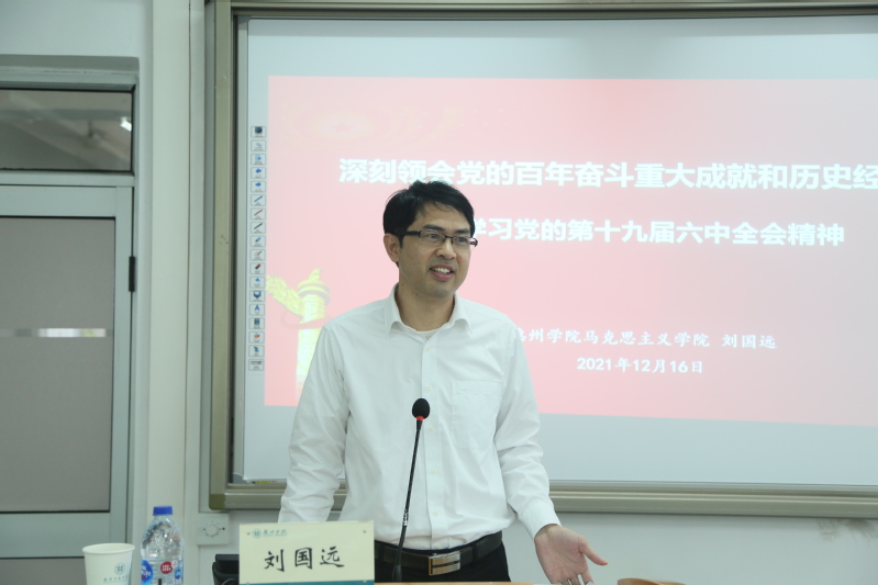 为深入学习党的十九届六中全会精神,12月16日下午,我院于旭日大楼309课室举行十九届六中全会精神宣讲学习专题讲座。讲座采取线上线下相结合的方式开展,由学校党委理论宣讲团成员、学生工作处五级职员刘国远老师主讲,学院组织员孙贇贇老师、党员教师代表、入党积极分子及学生代表参加讲座。讲座由党总支陈海容副书记主持。