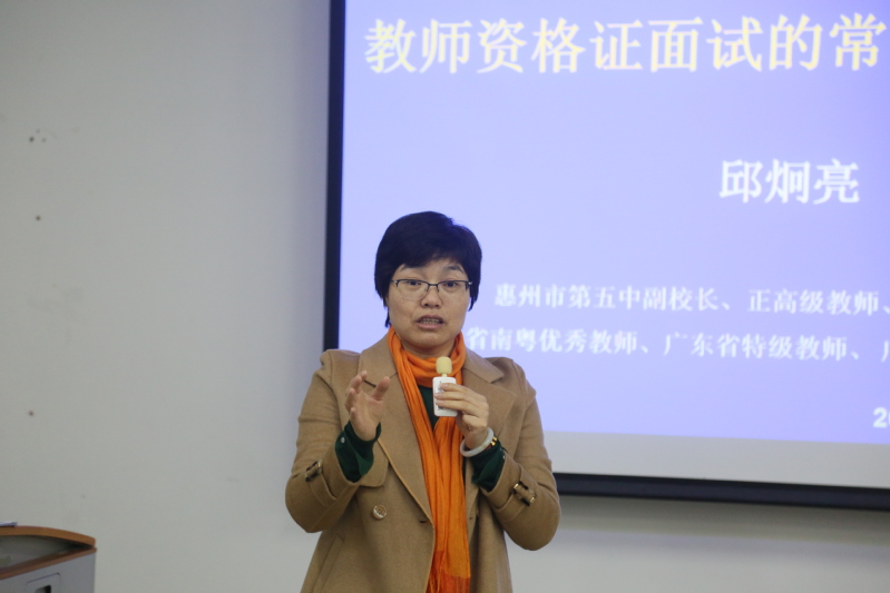 2020年12月20日下午,我院兼职教授、广东省名教师工作室主持人、惠州市第五中学副校长、正高级教师邱炯亮来校讲座,讲座在1-106大课室进行,主题为《教师资格证面试常见问题与对策》。我院党总支副书记陈海容、辅导员蒲苡禾、林培琪出席,2018级、2019级数学与应用数学专业学生共同聆听了讲座。讲座由学院思政导师王海青博士主持。