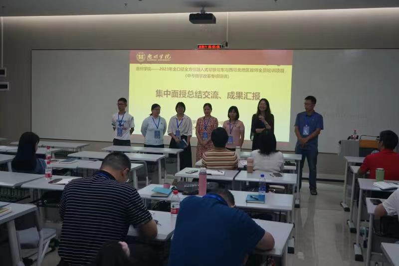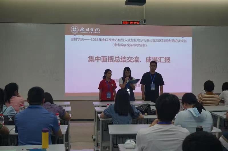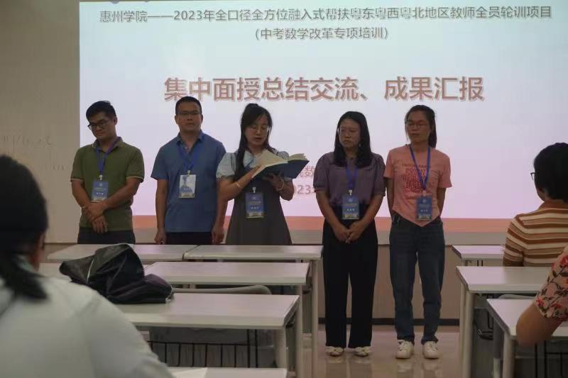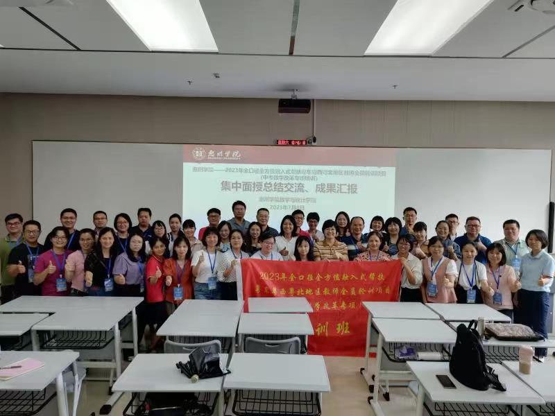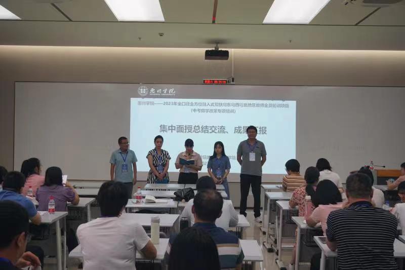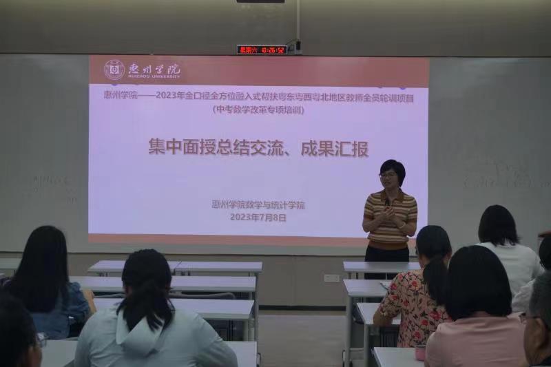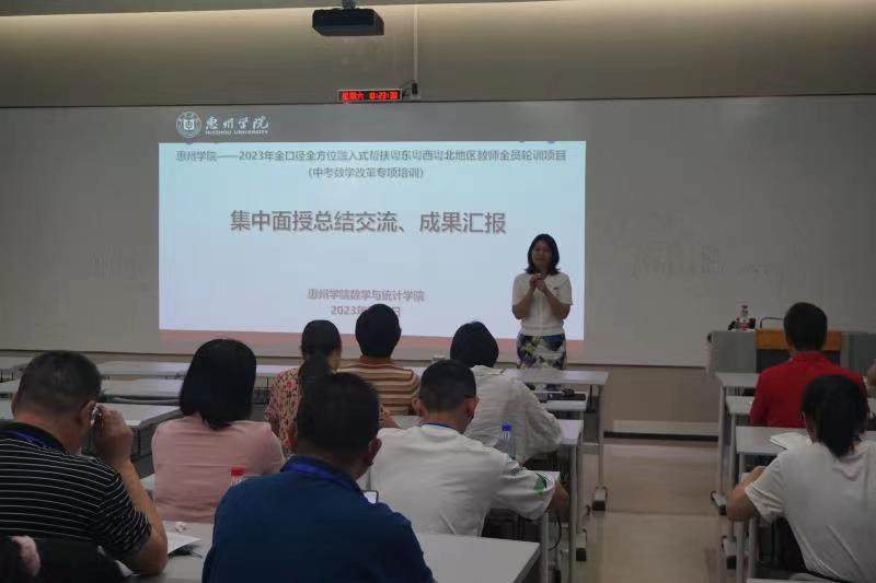 2023年7月8日,由广东省教育厅主办、惠州学院承办的2023年全口径全方位融入式帮扶粤东粤西粤北地区教师全员轮训项目(中考数学改革专项)培训班集中面授研修阶段性总结活动在科技楼A205举行。我院副院长王海青、党总支副书记陈海容及项目管理团队教师代表,全体参训学员参加了阶段总结活动。