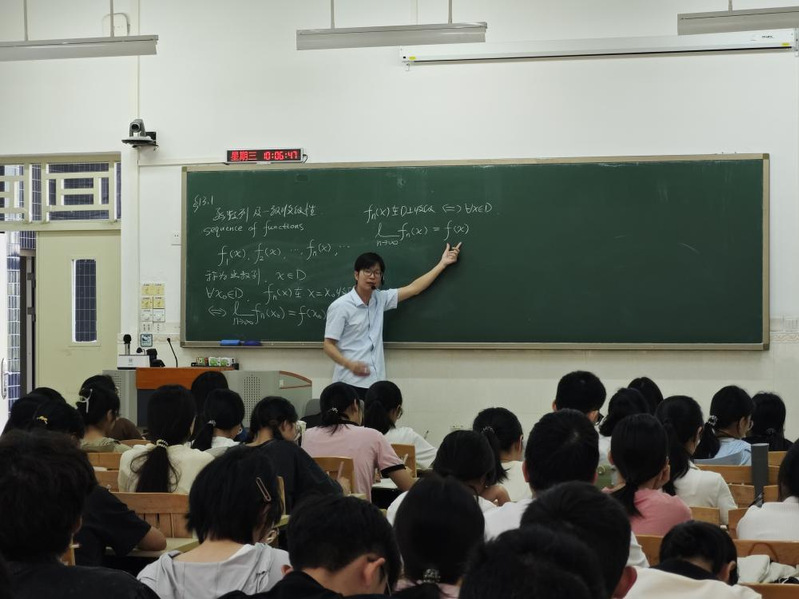 范铭灿老师在《数学分析》课堂上,以函数列一致收敛性为核心内容,运用思维导图式板书展开论证推演。其严谨的数学语言表达与启发式提问策略,充分展现了基础课程教学的逻辑之美。