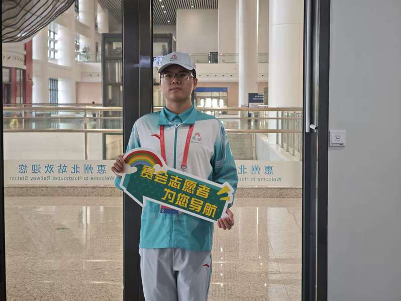 在轮滑赛事中,我的岗位是惠州南站接待服务助理,主要为乘坐高铁抵达的技术官员和运动员提供引导服务。帮助他们缩短出站时间,减少行李搬运的过程。在该岗位,我感受到了惠州对全运会的重视及工作人员的热情投入。