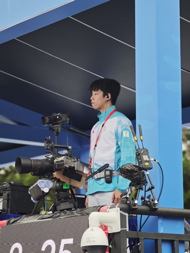 在跆拳道赛场,我的工作场所是观众看台。负责引导秩序、回应询问,确保每位观众都能安全地欣赏比赛。当选手们每一次有力的踢击与得分引来观众的欢呼与掌声时,是对我们志愿者辛勤付出的最好回响。我在其中真切地感受到了“奉献、友爱、互助、进步”的志愿精神如何在观众与志愿者之间传递与共鸣。而在滑板赛场,我的角色从台前转为幕后,担任计分计时助理。我保持高度专注,精准记录选手的每一轮表现,负责拍摄选手,客观记录他们的参赛过程,为赛事留存必要的影像资料,共同支撑起赛事公正的框架。我们每一个志愿者都是不可或缺的一个个“精密齿轮”。赛场的每一份精彩,都离不开志愿者团队的守护。