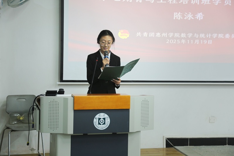 来自23数学2班的陈泳希同学作为第七期青马班学员代表,表达了对青马班培训学习的热切期待;同时她代表新一期学员表态,将坚决拥护共产党的领导,严格遵守青马班各项规章及考核制度,为努力成长为有责任、有担当的新时代青年而奋斗。