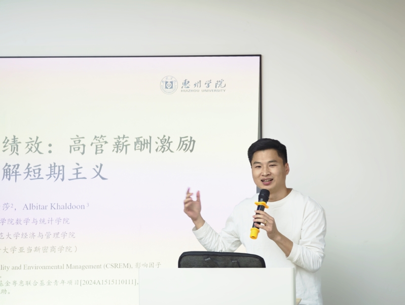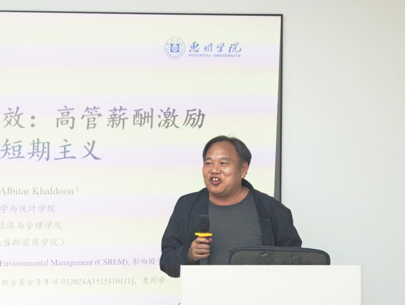 学术活动在生态园观山厅会议室举行,由唐建国教授主持,钟俊豪博士作了题为《盈余压力与ESG绩效:高管薪酬激励如何缓解短期主义》的学术报告,本次报告基于学术论文框架内容,从引言、文献与理论、研究设计、实证结果及结论几个方面展开分享。在交流环节,在场教师积极与钟俊豪博士围绕报告主题交流互动,进一步探讨学术内容。钟俊豪老师感谢学院领导及前辈对青年教师的培养和帮助,并表示将继续努力争取在科研方面有更大的进步和收获。