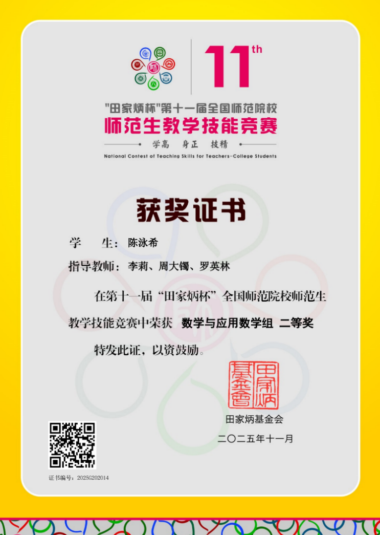 近日,第十一届“田家炳杯”全国师范院校师范生教学技能竞赛落下帷幕。我院2023级数学与应用数学2班陈泳希同学凭借扎实的教学功底与出色的临场表现,荣获数学与应用数学组全国二等奖,不仅追平我院在该赛事中的历史最佳战绩,更以决赛分数排名位列广东省第一,为学校与学院赢得了荣誉。